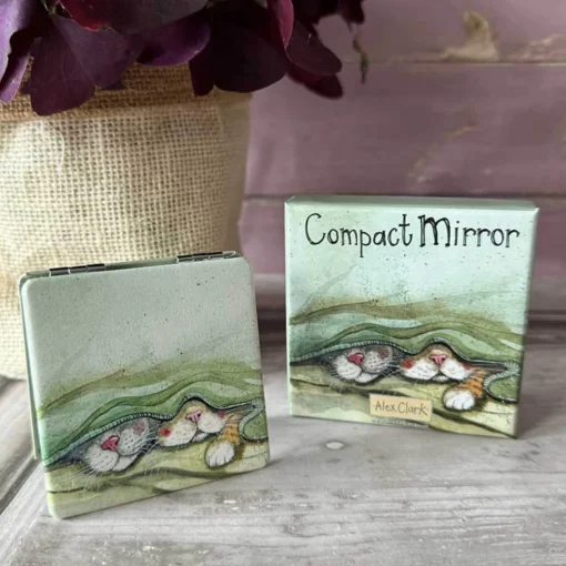 Alex Clark presents the ‘Cat Whiskers’ Vegan Leather Compact Mirror, a perfect blend of fun and practicality for your everyday needs. Featuring a double mirror, this compact is illustrated with two sleepy pussycats resting under a blanket, inspired by Alex’s love for animals. The soft vegan leather not only adds a touch of luxury but is also a cruelty-free and eco-conscious alternative to traditional leather. Presented in a matching gift box, this charming compact would make a lovely gift or special treat for yourself!