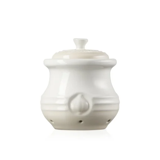 The Le Creuset Stoneware Garlic Keeper in Meringue is the perfect way to store your garlic cloves and heads. The lid is very secure to keep the light out and the odour and flavour in, it has vents around the base to ensure that the air inside the Garlic Keeper stays dry. Made from enamelled strong durable stoneware which is easy to clean and chip and scratch resistant and features the iconic Le Creuset three ring design. A perfect addition for all kitchens.