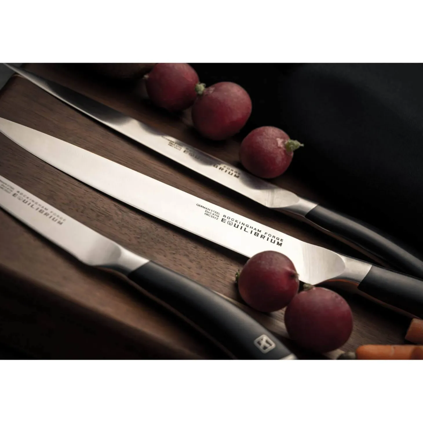 This 20cm Carving knife forms part of the Equilibrium range by Rockingham Forge. Each item in this collection features high-quality chromium-molybdenum-vanadian steel which has been ice-hardened for long-lasting sharpness and rust resistance. The knife-edge is hand-finished with taper-grinding for sharper cutting action and also a curved design handle for a more comfortable and easy grip. Perfect for slicing cooked joints of meat.