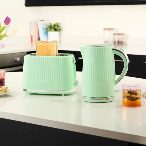 Russell Hobbs presents the Eden 2 Slice Toaster in Pistachio. The toaster’s sleek and modern design, with its grooved exterior, makes it an eye-catching addition to any kitchen countertop. It offers 6 browning settings and functions for frozen, reheat, and cancel, ensuring the perfect slice every time.